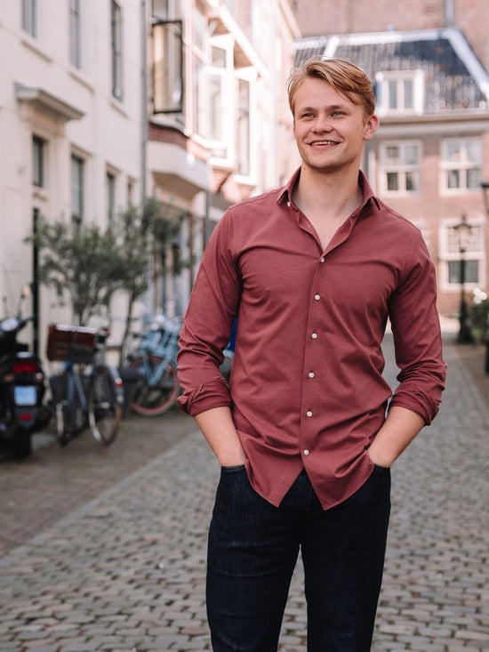 Oudroze overhemd met zeer subtiel ruitjespatroon van Michaelis met lichte knopen. Dit Michaelis overhemd heeft een rustige uitstraling. Daarmee is het heel geschikt om te dragen onder een pak, in combi met een spijkerbroek of onder een pullover. Het strijkvrije...